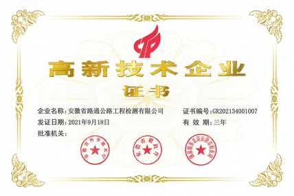 12月14日,太阳成集团tyc下属全资子公司安徽省路通公路工程检测有限公司(以下简称路通检测公司或公司)喜获“高新技术企业”荣誉,标志着路通检测公司正...