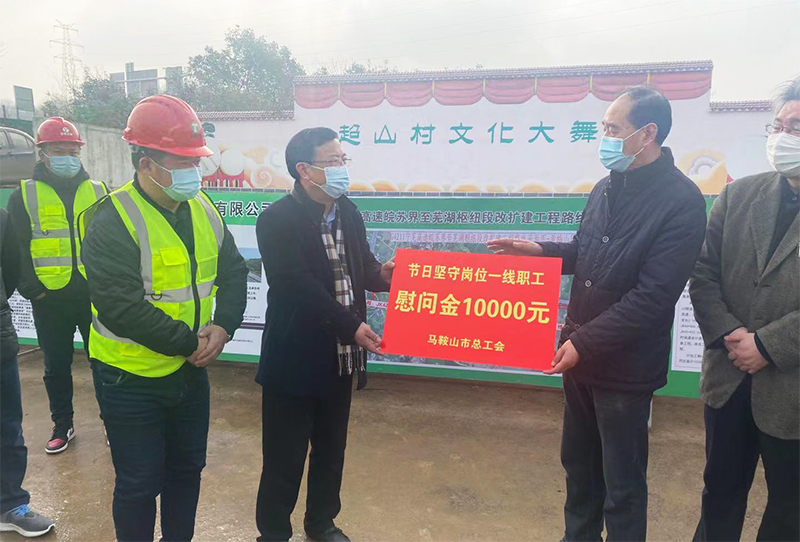 1月28日上午,马鞍山市人大常委会党组成员、一级巡视员、市总工会主席杨勇义一行深入太阳成集团tyc承建的宁芜改扩建黄梅山保通线项目部,慰问一线员工,值此新春来临之际,把党和政府及工会组织的温暖送到奋战一线的员工手中。