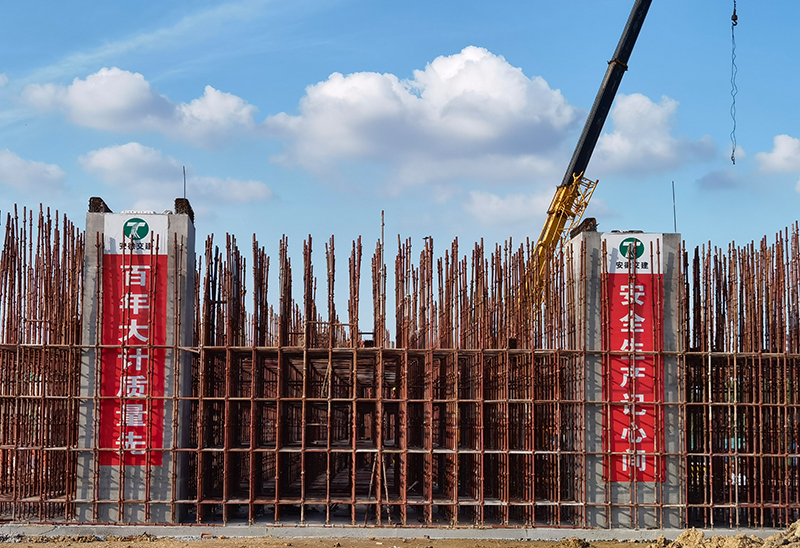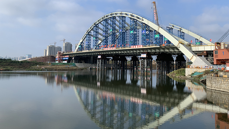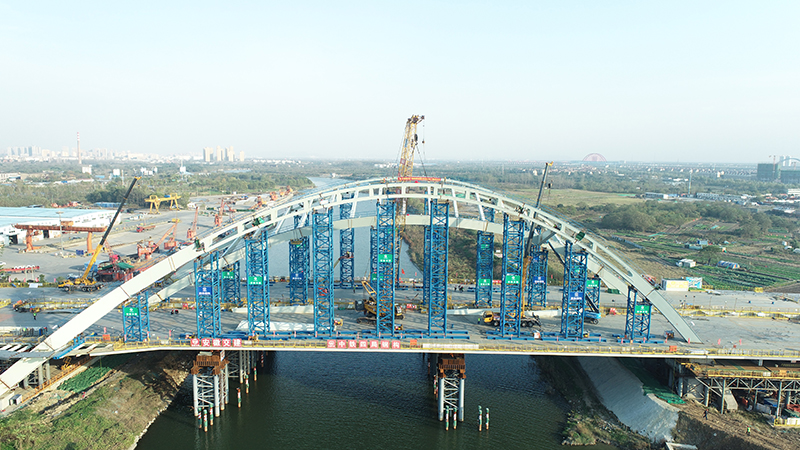 其中,广德路跨南淝河段桥梁总长661米,由主桥、南北岸引桥三部分组成,主桥桥长230米,主梁采用55+135+45钢箱梁,桥宽53米,采用非对称无推力钢拱桥,步履式顶推法施工,该桥梁目前为国内在建同类结构跨度最大钢箱拱桥。另,桥梁大体积承台8号墩混凝土8870立方,净矢高27.5米,本工程拱肋为三维曲线造型,边拱在平面的投影亦为曲线,拱脚为箱形,中间部位边拱由两个上拱箱和一个下拱箱组成,三个独立拱箱在第一根吊杆之前合并并过渡到一个整体箱形截面,结构复杂,拱肋的精细化加工,梁拱关键节点的定位及安装是本工程的重点,也是本工程的难点。南北岸引桥总长431米,采用上下行两幅布置,单幅桥宽24.5米,采用现浇预应力混凝土连续箱梁结构。