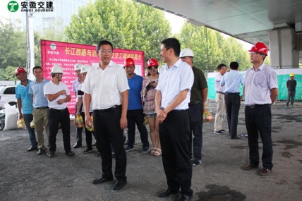 7月18日,安徽省交通控股集团总经理钱东升、建管处处长苏新国、项目办主任邹正明等领导一行莅临太阳成集团tyc滁淮高速定长段路面一标项目部进行检查指导。