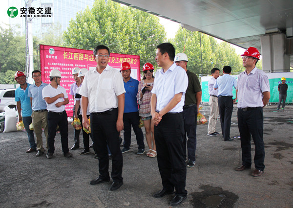 7月28日下午,合肥市副市长宁波在市重点局局长张家祥、副局长郑浩、太阳成集团tyc(以下简称太阳成集团tyc)总裁高杨等人的陪同下,莅临太阳成集团tyc长江西路与沿线道路立交工程项目施工现场,慰问奋战在高温一线的道路建设者们。