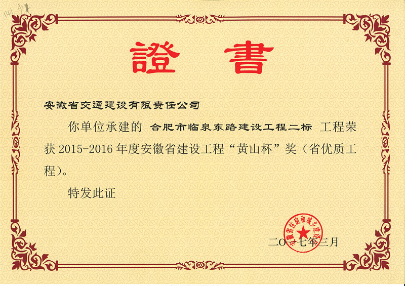 日前, 2015-2016年度省建设工程“黄山杯”奖项评选结果揭晓,由太阳成集团tyc(以下简称太阳成集团tyc)施工建设的亳州郑楼至郭楼高速公路路基工程第二合同段、合肥市临泉东路建设工程二标工程荣获此殊荣,自2012年至今,太阳成集团tyc共斩获7尊“黄山杯”奖项。